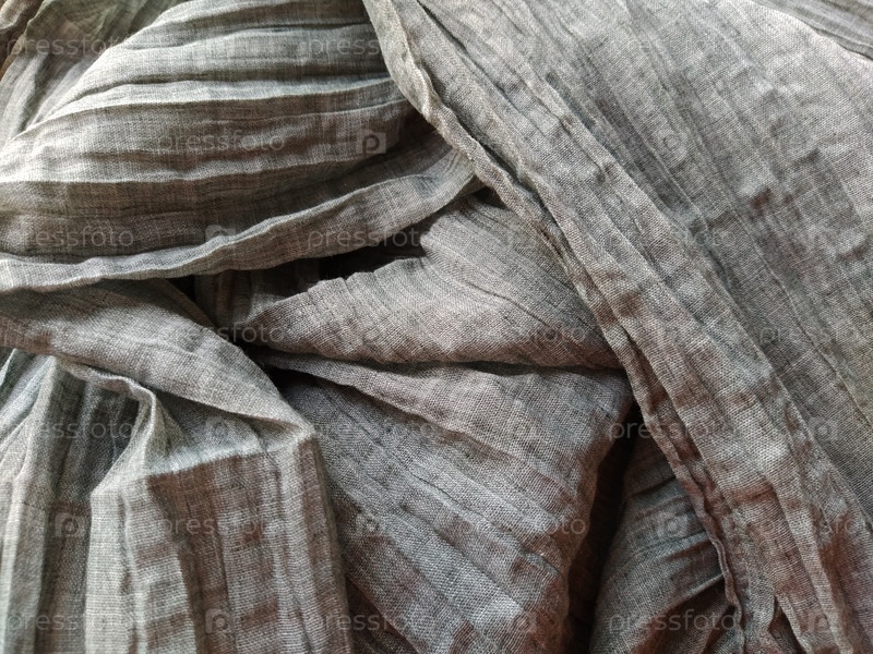 Ткань прозрачная портьерная. Красивый серый цвет. Материал штор небрежно сложен и помят. Образец ткани. Вариант оформления интерьера