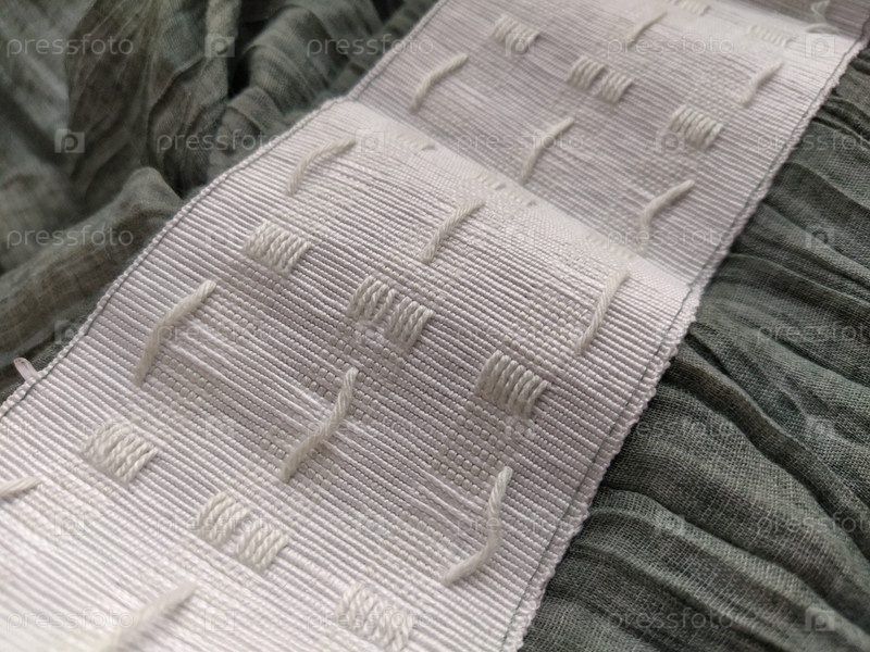 Широкая белая портьерная тесьма, пришитая к серой плиссированной ткани. Отделка верха портьеры или легкого тюля