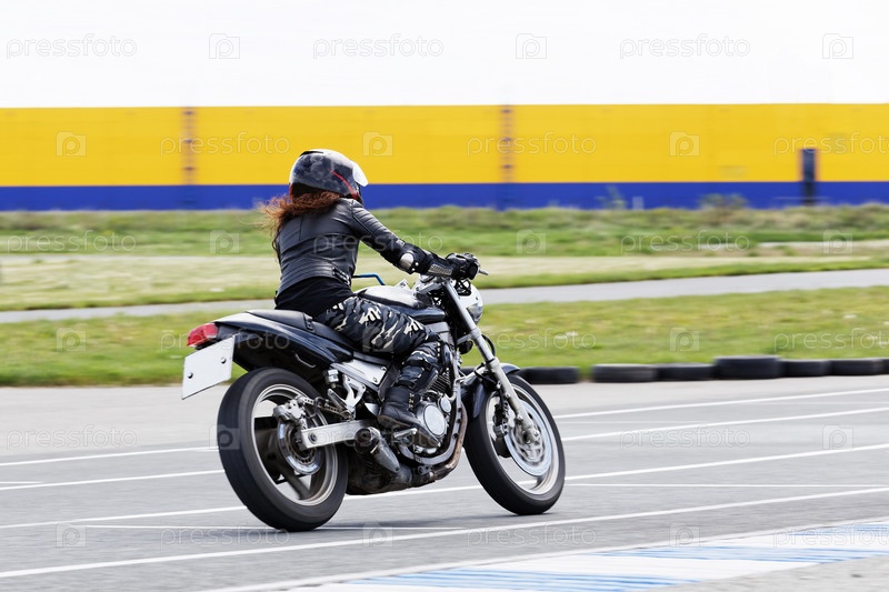 Рыжая девушка мчится на мотоцикле по спортивной трассе