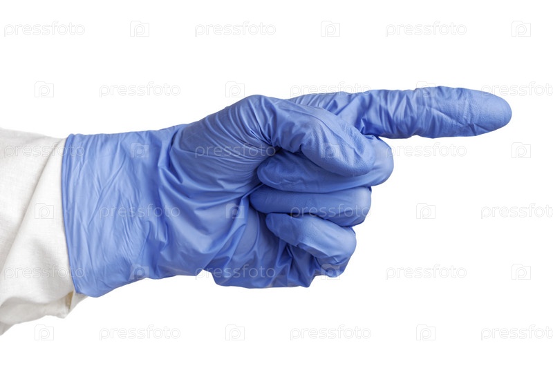 Человеческая рука с указательным пальцем в синей медицинской перчатке. Изолированные на белом фоне