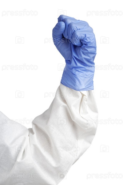 Человеческая рука сжимает кулак в синей медицинской перчатке. Изолированные на белом фоне