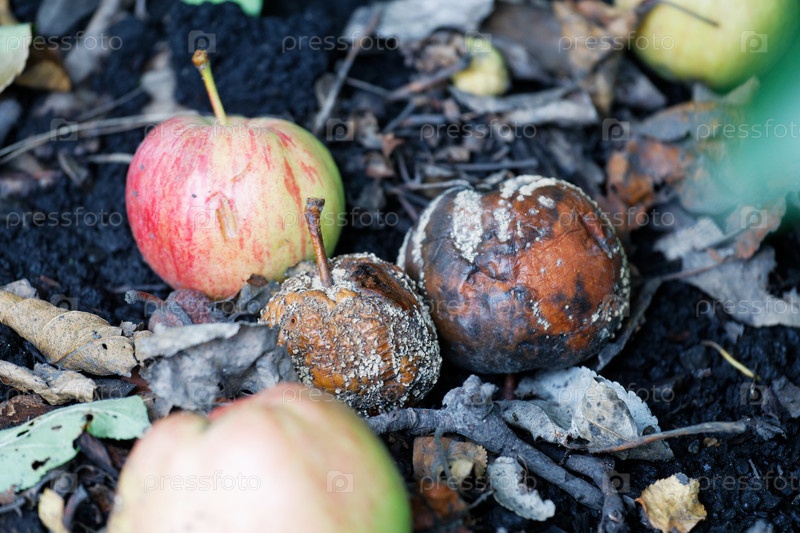 Перезрелые и гнилые плоды яблок лежат на земле в грязи