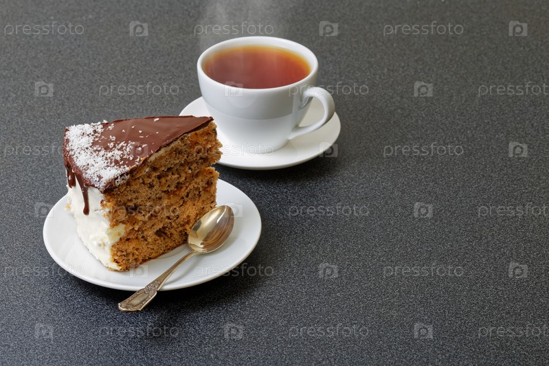 Чашка чая и кусок домашнего торта, политый шоколадом и посыпанный кокосовой стружкой