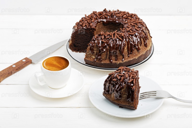 Домашний шоколадный кекс на белом деревянном столе. Вид сверху