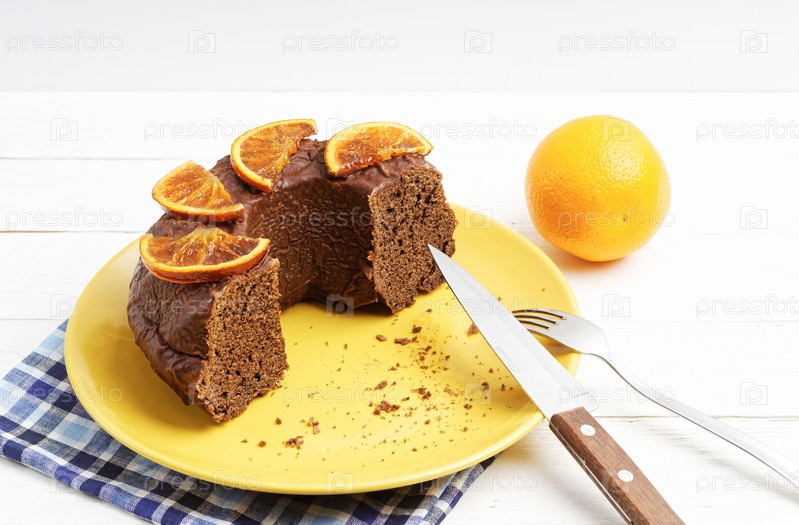 Домашний шоколадный кекс на белом деревянном столе. Вид сверху