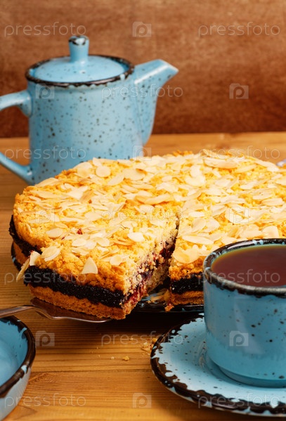 Крупный план домашний торт с черной смородиной, украшенный миндальными лепестками и чашкой чая на деревянном столе