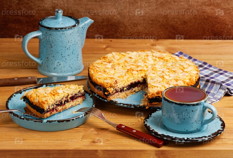 Домашний торт с черной смородиной, украшенный миндальными лепестками и чашкой чая на деревянном столе