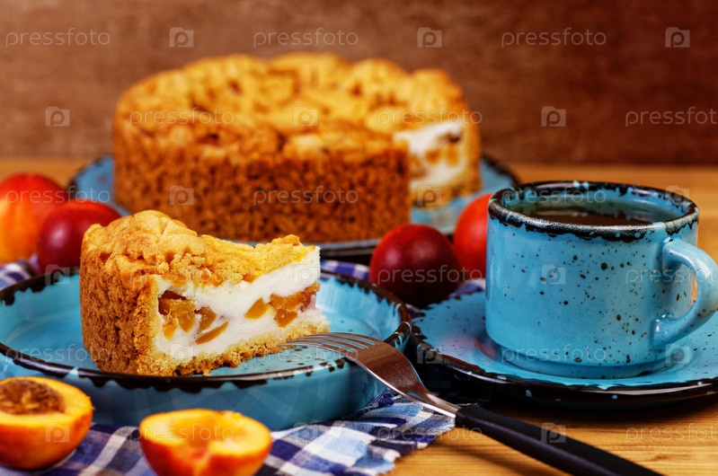 Домашний пирог с нектаринами и чашкой чая на деревянном столе. Мелкий фокус