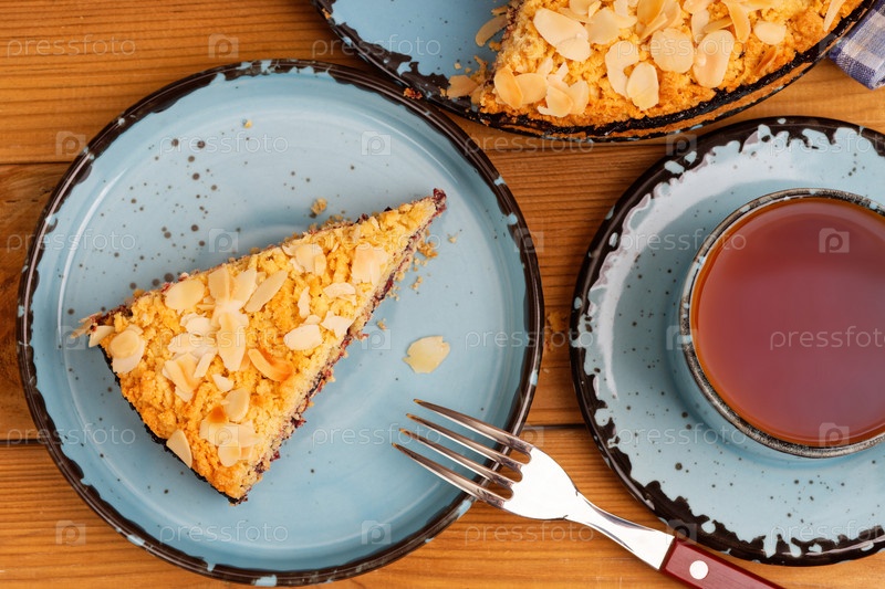 Домашний торт с черной смородиной, украшенный миндальными лепестками и чашкой чая на деревянном столе. Вид сверху