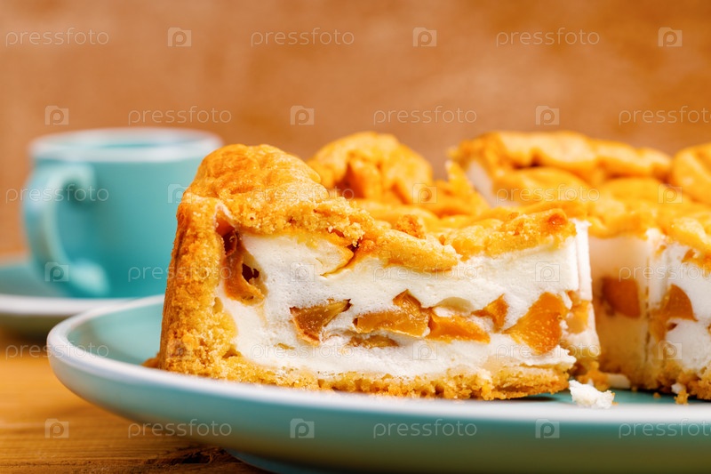 Крупный план домашний пирог с нектаринами и чашкой кофе эспрессо на деревянном столе. Мелкий фокус
