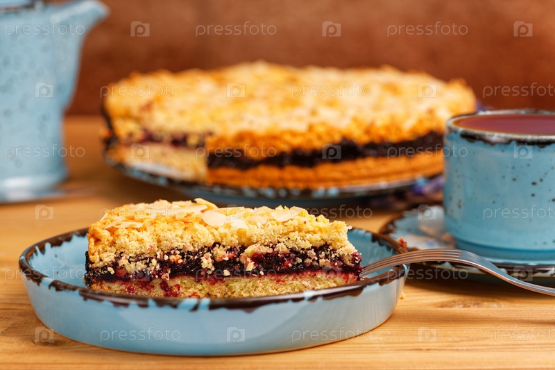 Крупный план домашнего торта с черной смородиной, украшенного миндальными лепестками и чашкой чая на деревянном столе