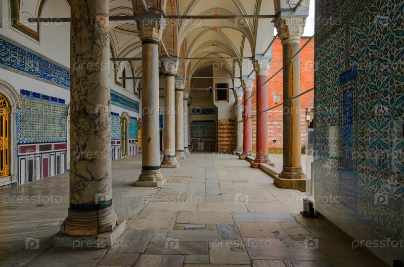Стамбул, Турция - 05 марта 2018 г.: Великолепно украшенные здания в знаменитом дворце Топкапы (Topkapı Sarayı), главной резиденции и административной штаб-квартире османских султанов в весенний день