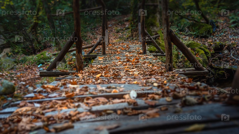 Старый деревянный мост через ручей в осеннем европейском лесу. Греция, Афон