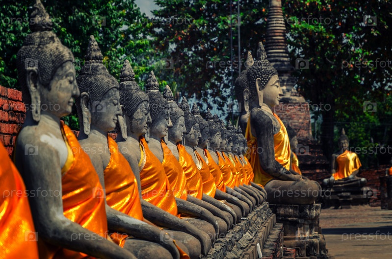 Выровненные статуи Будды в храме Ват Яй Чаймонгкол Аюттхая, Бангкок, Таиланд