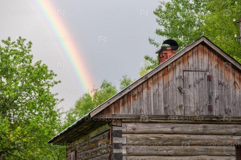 Небольшой загородный дом летним вечером. Радуга над домом. Красивый закат. Цветы в саду. Россия