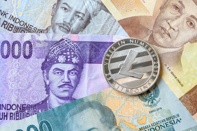 Litecoin с подлинной банкнотой индонезийской рупии.Бизнес и финансовая концепция