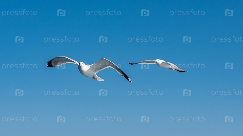 Белая чайка летит в голубом солнечном небе над побережьем моря