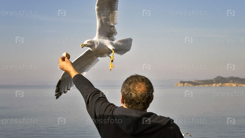Кормление чаек из рук хлебом