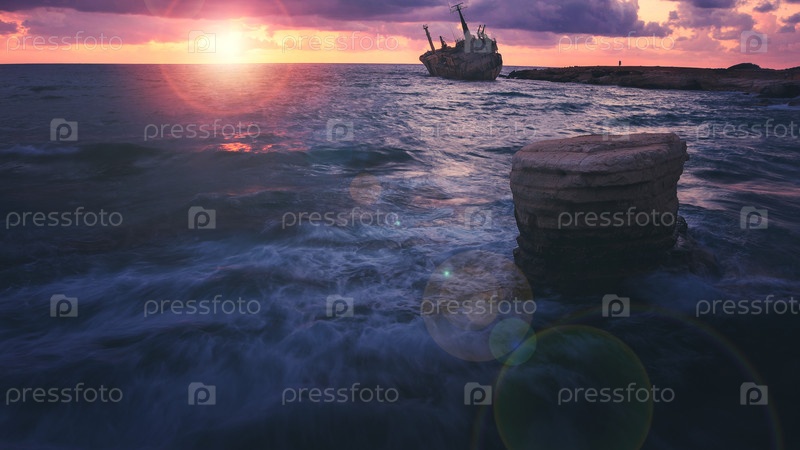 Кораблекрушение (Эдро III) недалеко от Пафоса, Кипр на закате