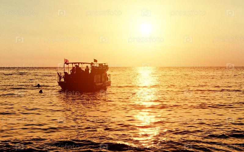 Силуэты на пляже в лучах заходящего солнца на острове Самет, Таиланд
