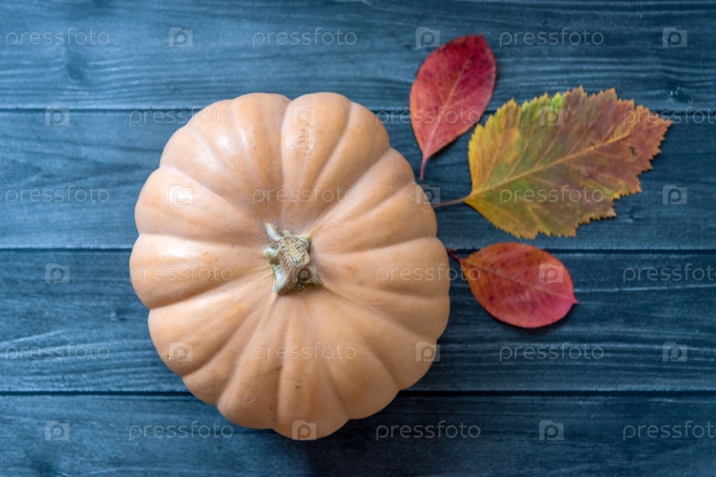 Деревянный стол украшен овощами, тыквами, кукурузой и осенними листьями. Осенний фон. Концепция Дня благодарения или Хэллоуина