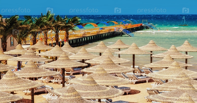 Шезлонг и зонтики на пляже на фоне голубого неба и моря. Египет, Хургада