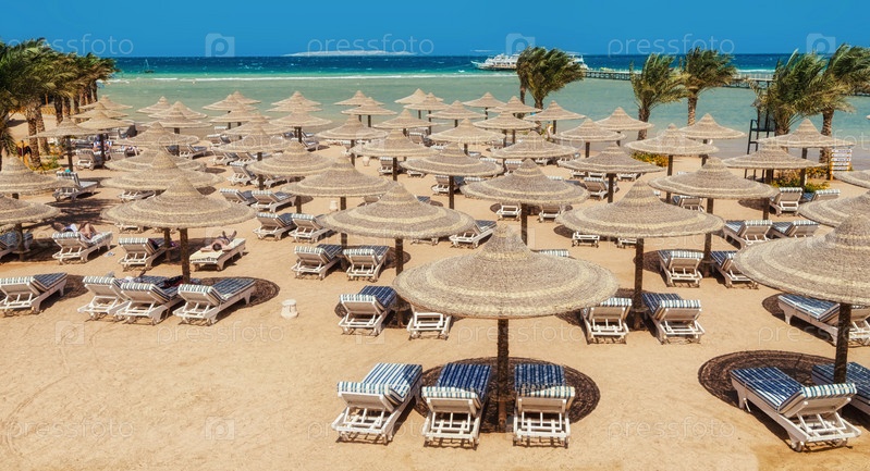 Шезлонг и зонтики на пляже на фоне голубого неба и моря. Египет, Хургада