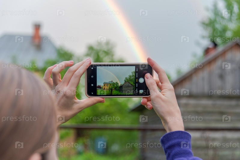 Молодая женщина фотографирует на телефон радугу на фоне старых домов в деревне. Вид сзади