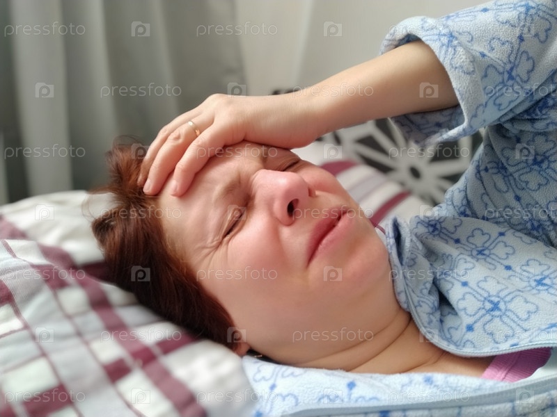Больная женщина в постели. Головная боль, насморк и насморк. Бледность лица и слабость тела. Плохое самочувствие. Больной лежит на подушке, придерживая рукой лоб. Острая боль и гримаса