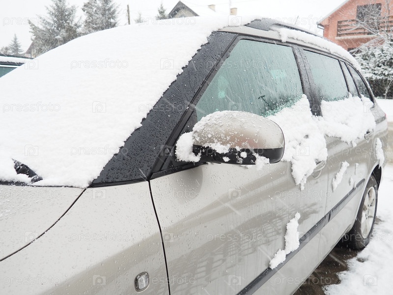 Снег и лед на лобовом стекле, ретровизорах и зеркалах заднего вида автомобиля. Условия зимнего вождения. Уборка снега. Дорожное движение зимой. Металлический автомобиль. Сугробы и слякоть
