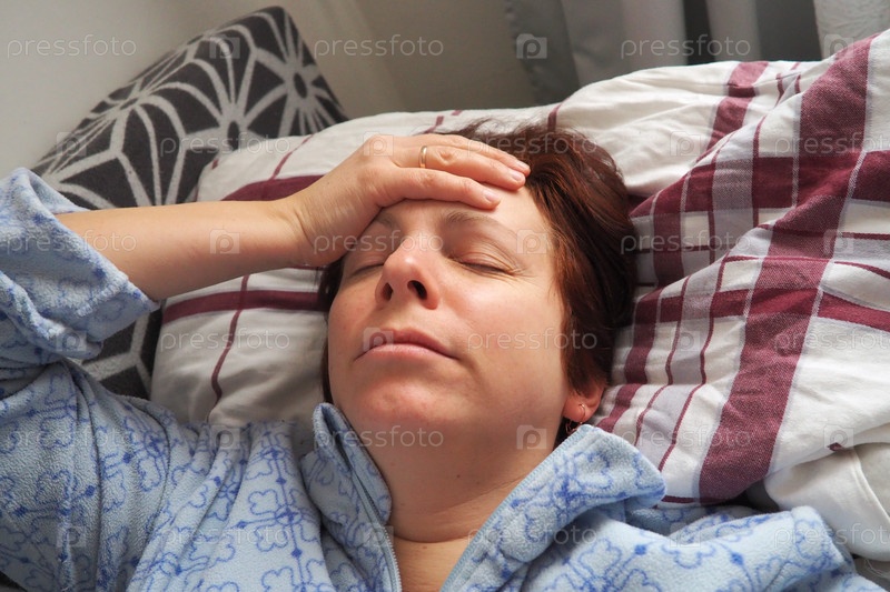 Больная женщина в постели. Головная боль, насморк и насморк. Бледность лица и слабость тела. Плохое самочувствие. Больной придерживает рукой лоб и прикрывает глаза