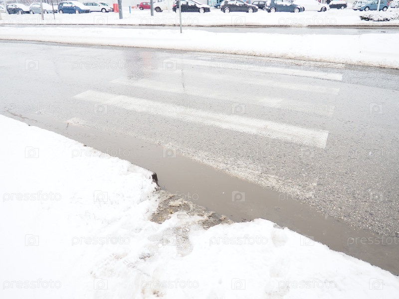 Снег, лед, слякоть и зимняя грязь на пешеходном переходе. Температура воздуха около 0. Сложные условия движения. Тормозной путь автомобиля. Правила дорожного движения. Инфраструктура и дорожные службы