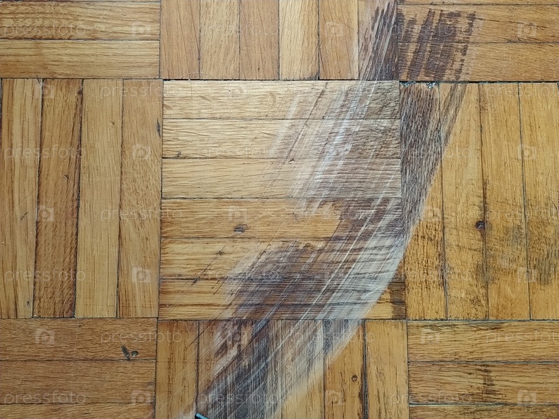 Поцарапанный паркет в комнате. Царапины, сколы и вмятины на полу. Паркет требует ремонта