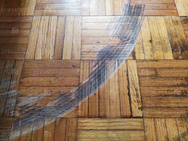 Поцарапанный паркет в комнате. Царапины, сколы и вмятины на полу. Паркет требует ремонта