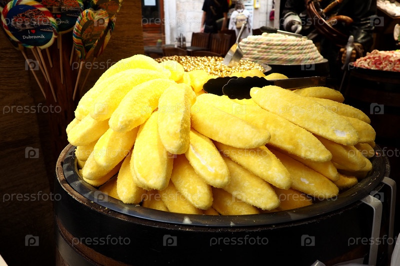 Эклеры в виде желтых бананов на блюде. Витрина кондитерской Дубровник Хорватия. Туристам продают вкусные сладкие пирожные. Необычная форма выпечки с желтой сахарной пудрой