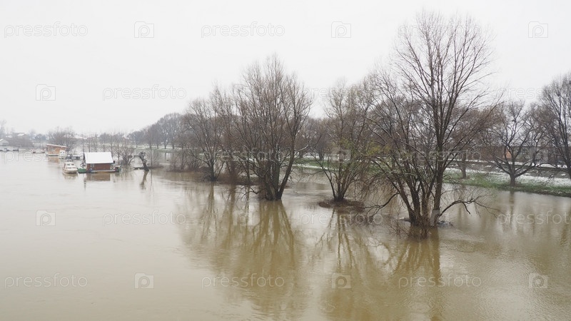 Мацванска-Митровица, Сербия, 27.01.2023 Мост через реку Сава. Наводнение после сильных дождей и таяния снега. Стремительный поток мутной воды. Деревья, лодки и пирсы в воде. Махва зимой