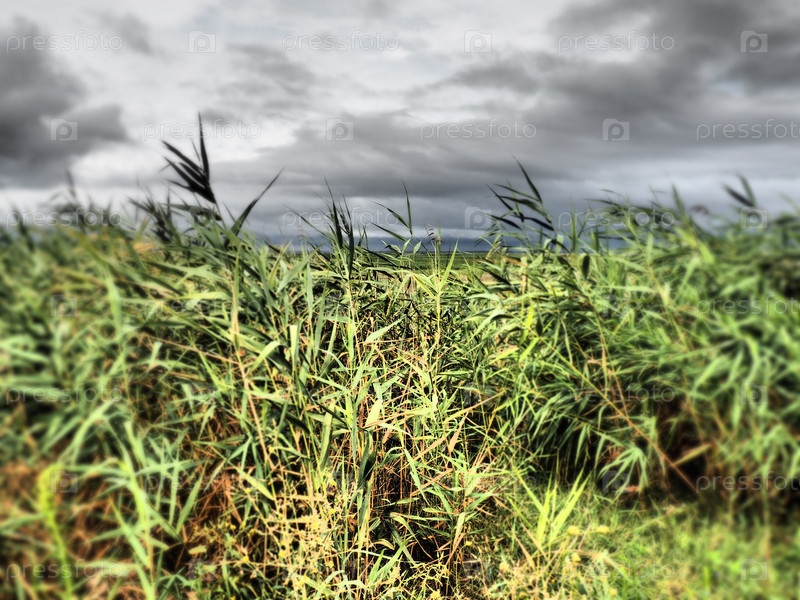 Обыкновенный тростник или южный тростник, Phragmites australis, высокая многолетняя трава рода Тростниковые. Флора эстуария. Увлажняющее растение. Размыто по бокам. Бурная погода