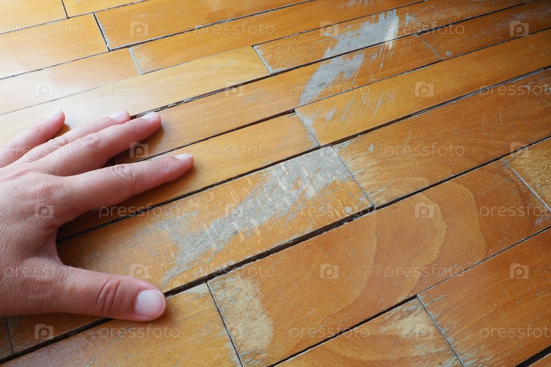 Старый, поцарапанный паркет нуждается в уходе. паркет поврежден царапинами от длительной эксплуатации. Руки мастера показывают повреждение пола