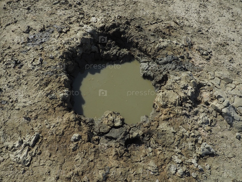 Кратер с серой вулканической лечебной глиной. Дыра с выдающейся аморфной массой из недр земли. Грязевое и газовое извержение. Темрюк, Россия. Поверхность почвы с трещинами. Текстура селевых трещин