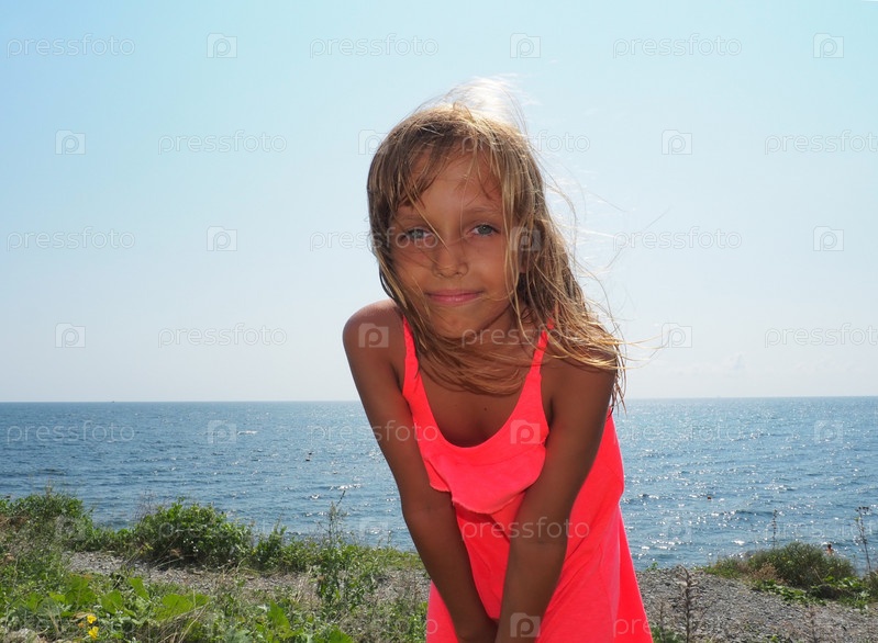 Молодая красивая девочка 8 лет со светлыми длинными волосами, загорелой кожей улыбается на фоне морского пейзажа. Розовый сарафан. Солнечные лучи встречного света на волосах ребенка. Голубое небо и горизонт