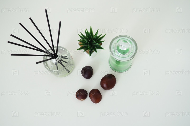 Ароматические палочки в стеклянном кубическом сосуде с эфирными маслами. Декор интерьера. Белый фон. Сансевьера или алоэ в горшке. Восковая свеча в стильной стеклянной колбе с крышкой. Плоды каштана