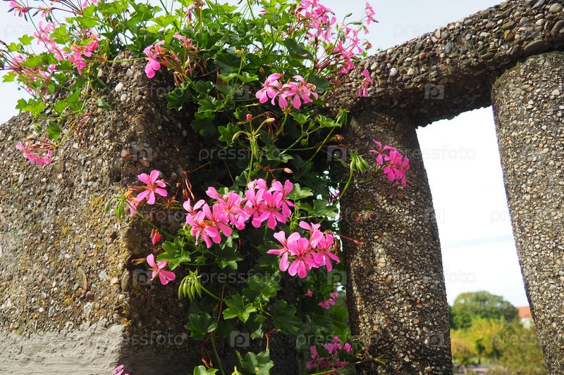 Цветущая розовая плющелистная герань пеларгония, вертикальный дизайн озеленения улиц и парков. Красивые крупные цветы герани пеларгонии герани. Цветоводство и садоводство. Баня Ковиляча