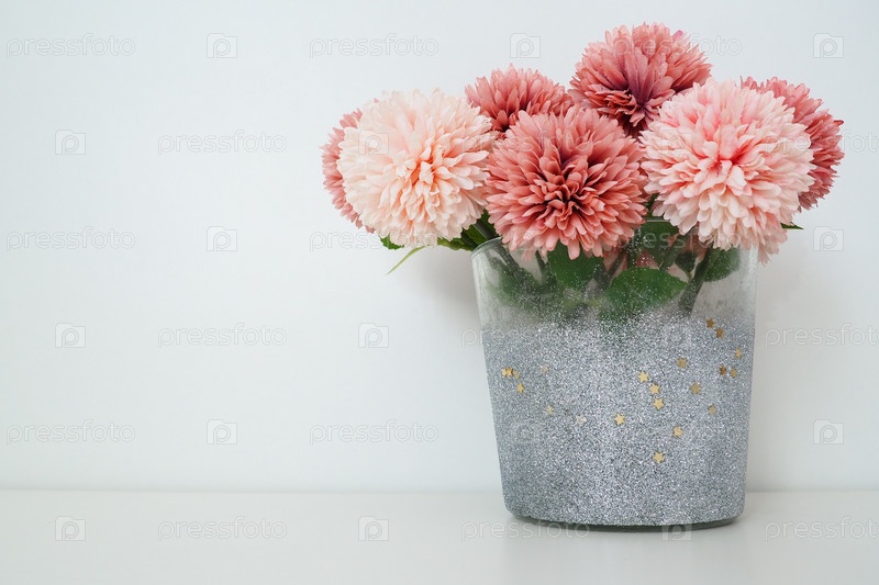 Букет розовых махровых искусственных цветов в серой серебряной вазе на белом фоне. Натюрморт, вариант украшения интерьера. Декор комнаты. Свободное место для текста