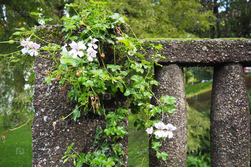 Цветущая белая плющелистная герань-пеларгония в вертикальном дизайне озеленения улиц и парков. Красивая крупная пеларгония-герань-герань. Цветоводство и садоводство. Баня Ковиляча