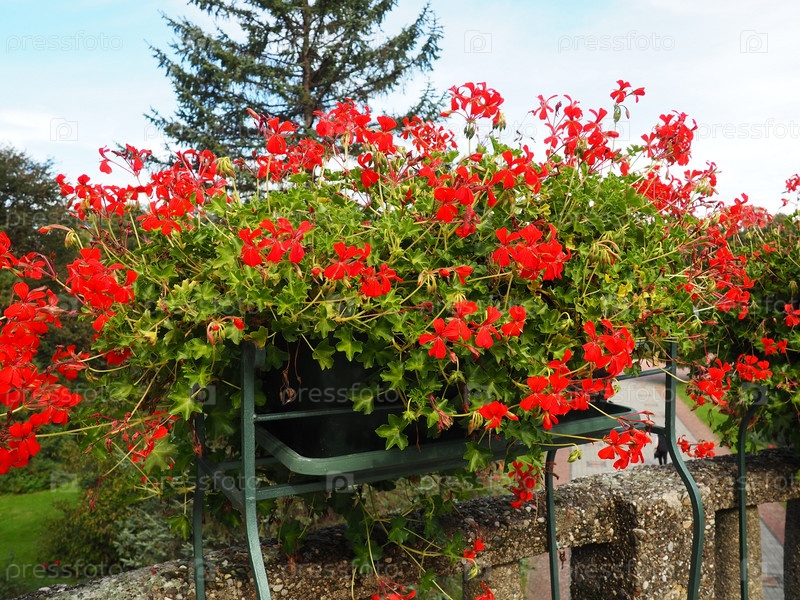 Цветущая красная плющелистная герань-пеларгония в вертикальном дизайне озеленения улиц и парков. Красивая крупная пеларгония-герань-герань. Цветоводство и садоводство. Баня Ковиляча