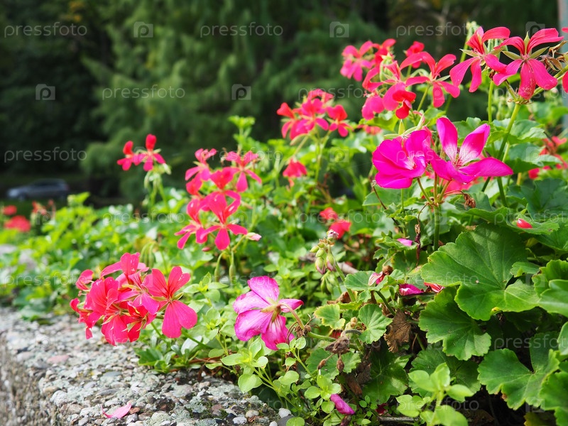 Цветущая розовая плющелистная герань пеларгония, вертикальный дизайн озеленения улиц и парков. Красивые крупные цветы герани пеларгонии герани. Цветоводство и садоводство. Баня Ковиляча