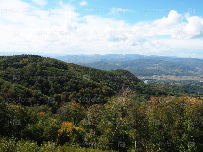 Гучево, гора, самая высокая точка Црни врх, относится к нижним Валевско-Подриньским горам. Вид на реку Дрина, Босния и Герцеговина. Пейзаж от Сербии до Боснии, смотровая площадка