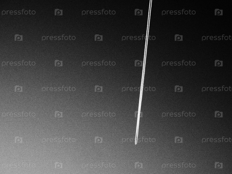 След от летящего в небе самолета. Черно-белая монохромная фотография. Выбросы керосина или гептилового ракетного топлива. Экологическая концепция. Авиационный бизнес и пассажирские перевозки