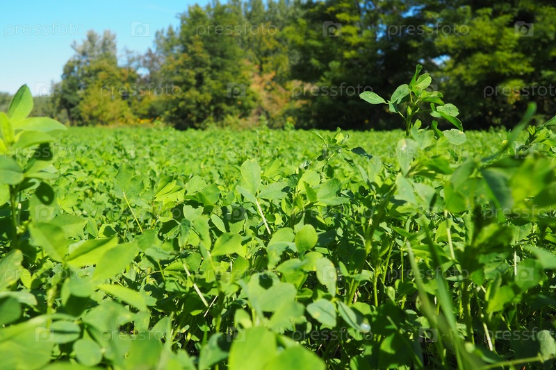 Поле с зеленым клевером. Организованная посадка клевера. Clover Trifolium, род растений семейства бобовых Fabaceae, Moth Faboideae. Медонос сельскохозяйственных культур, кормовое растение, сидераты