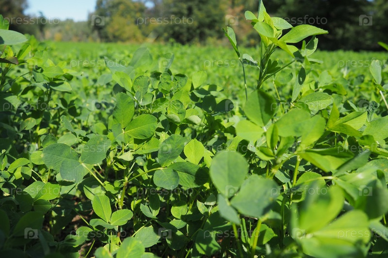 Поле с зеленым клевером. Организованная посадка клевера. Clover Trifolium, род растений семейства бобовых Fabaceae, Moth Faboideae. Медонос сельскохозяйственных культур, кормовое растение, сидераты